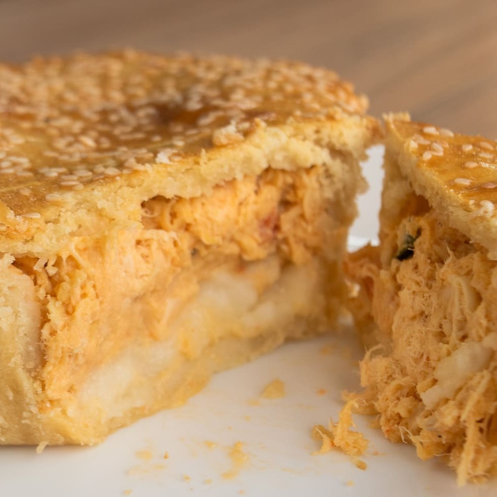Massa dourada e saborosa com recheio de frango e requeijão. Preço por unidade de aproximadamente 300g.