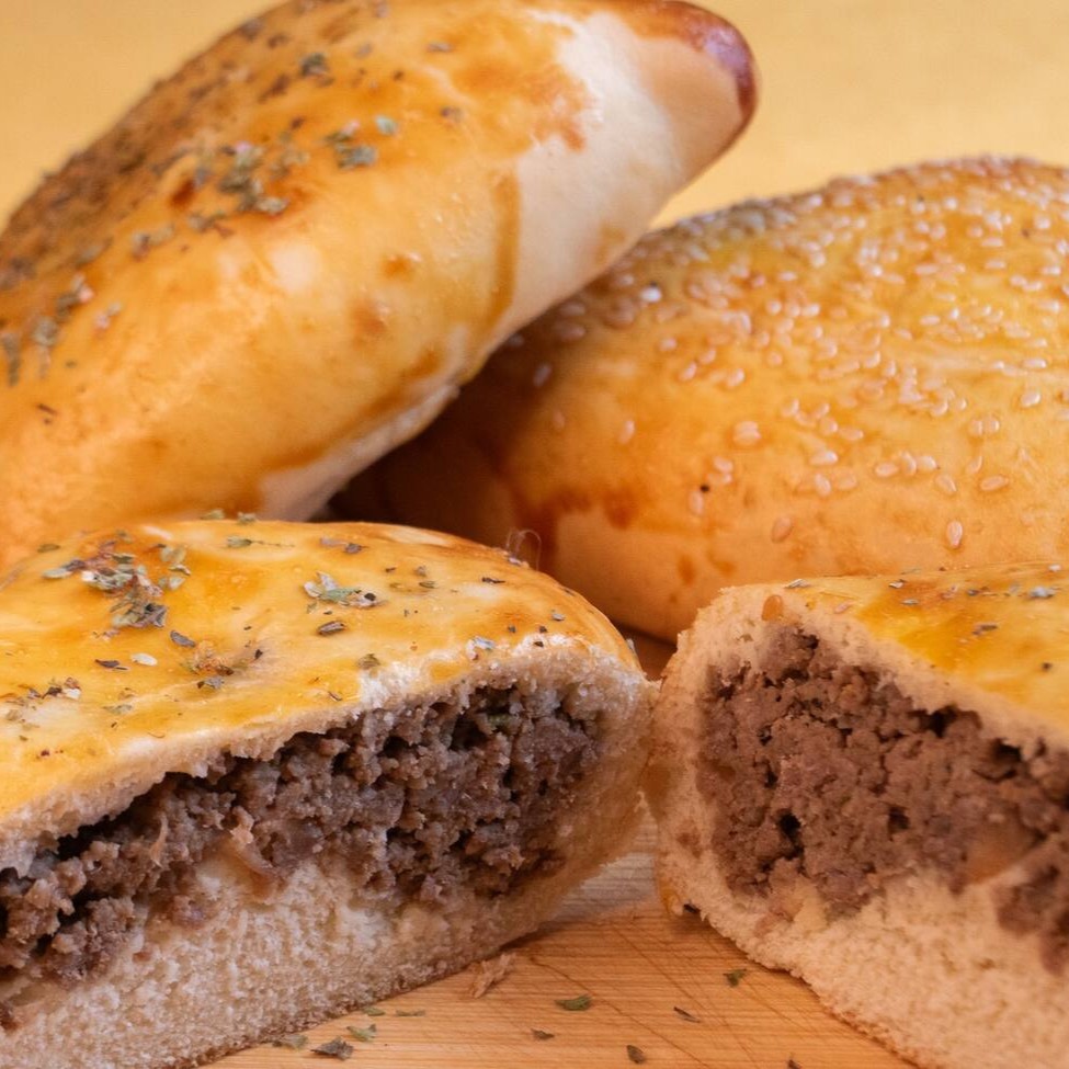 Massa macia com recheio generoso de carne bem temperada. Preço por unidade de aproximadamente 180g.