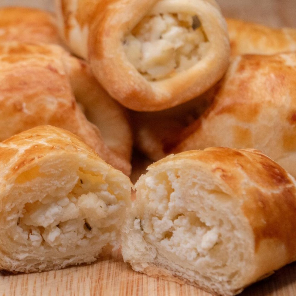 Massa crocante recheada com queijo saboroso. Preço por unidade de aproximadamente 30g.