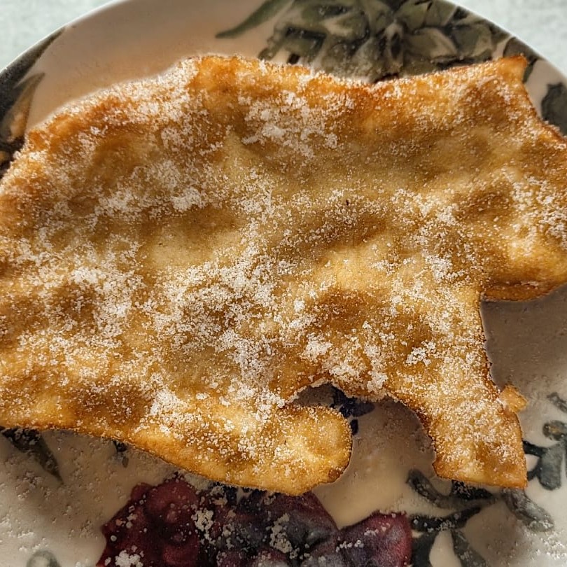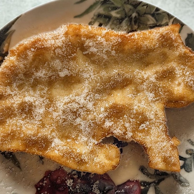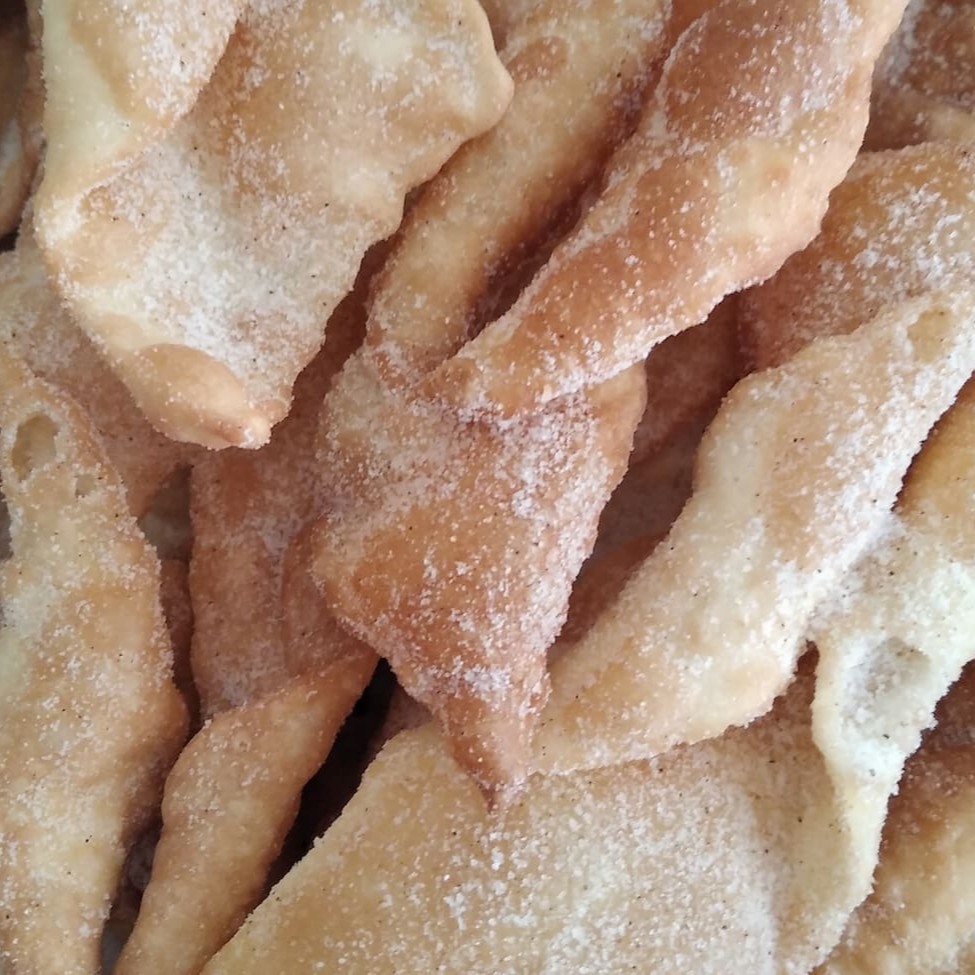 Cuca virada com massa fininha e crocante, frita e coberta com açúcar e canela. Pacote com 150g