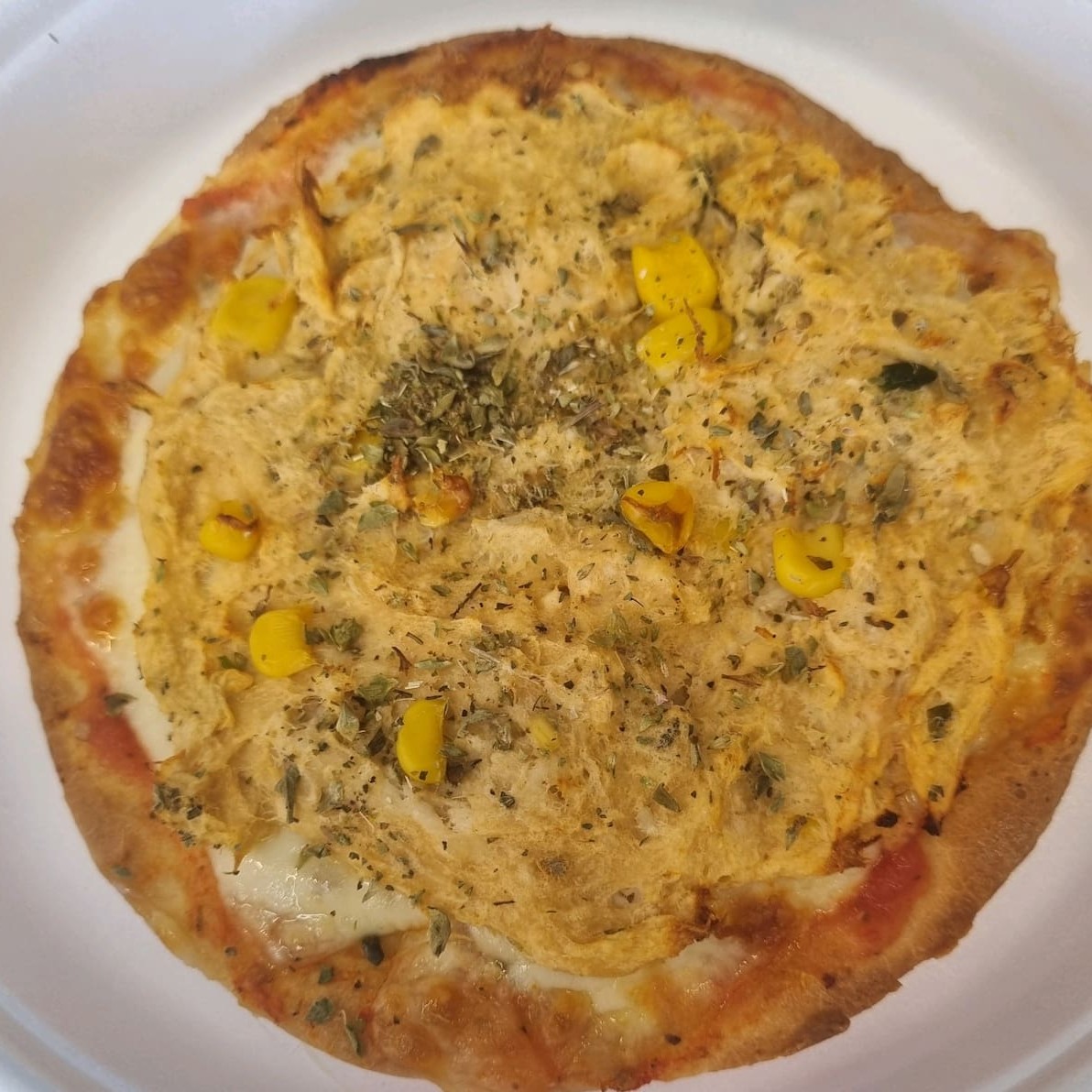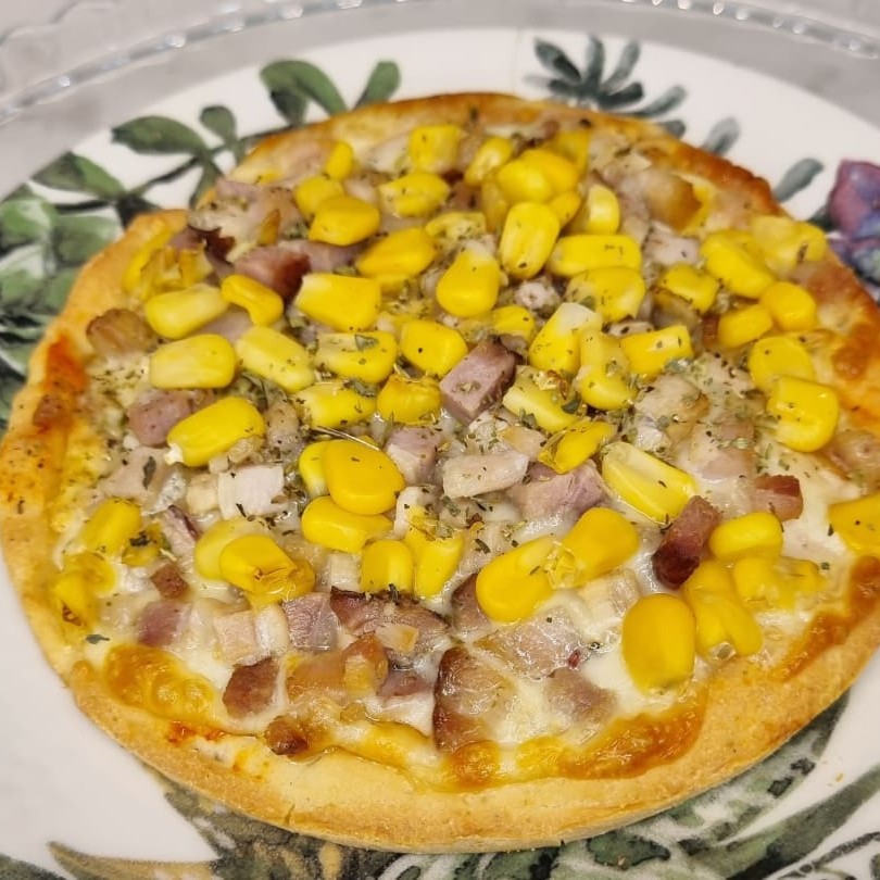 Sem glúten e sem lactose, massa pré-assada, com queijo zero lactose, molho de tomate natural, milho com bacon e orégano.