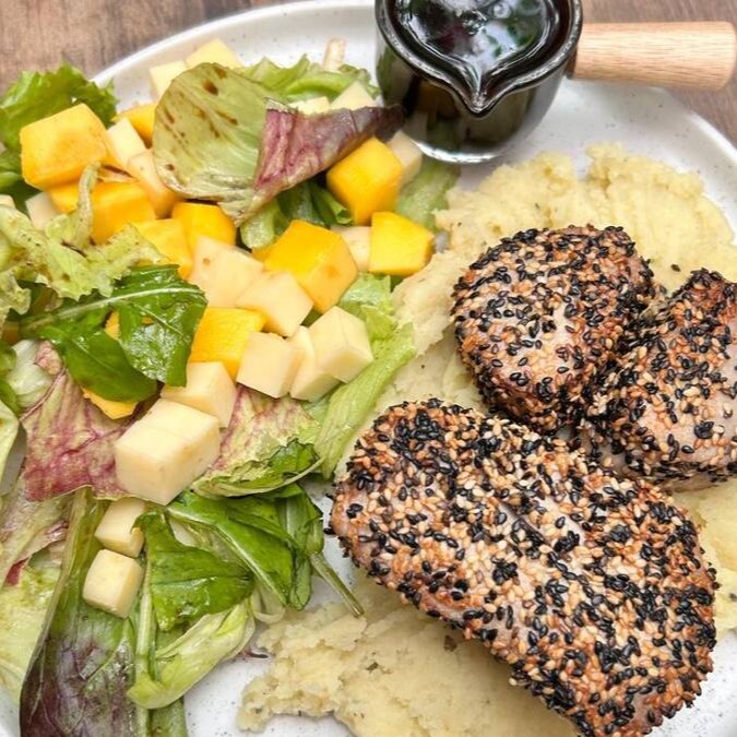 Atum grelhado com crosta de gergelin, purê de batata doce, salada de palmito com mix de folhas e manga, molho da casa.