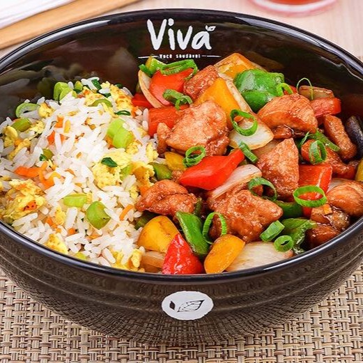 Coxa e sobrecoxa de frango, cebola, pimentões (vermelho, amarelo e verde), arroz primavera (cenoura, vagem, ovos e cebolinha) e molho da casa.