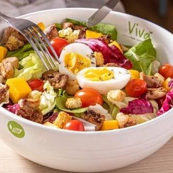 Coxa e sobrecoxa de frango, ovos, mix de folhas (alface americana, rúcula e chicória italiana), tomate cereja, abacate, molho de mostarda e mel, broto de alfafa, azeite de oliva com especiarias, orégano e croutons.