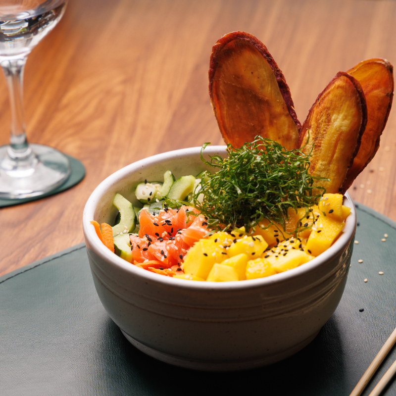 Salmão fresco temperado com molho da casa,chips da casa,arroz japonês,cenoura,pepino,cebola salteada,gengibre, manga, mix de gergelim,crispy de couve e molho da casa