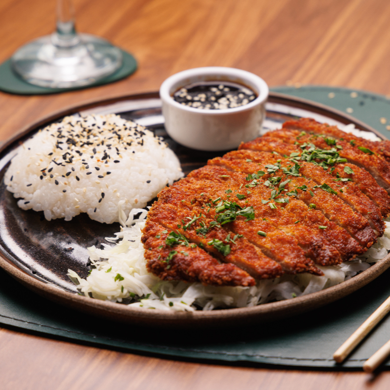 ENTRADA: Mini Salada Aurora - Mix de folhas da estação, cenoura, brócolis, tomate cereja, frutas da estação, croutons e molho de mostarda e mel. PRATO PRINCIPAL: Pork Tonkatsu - Arroz japonês, repolho refogado, mignon suíno e empanado na panko, molho da casa. SOBREMESA: Pudim de Leite.