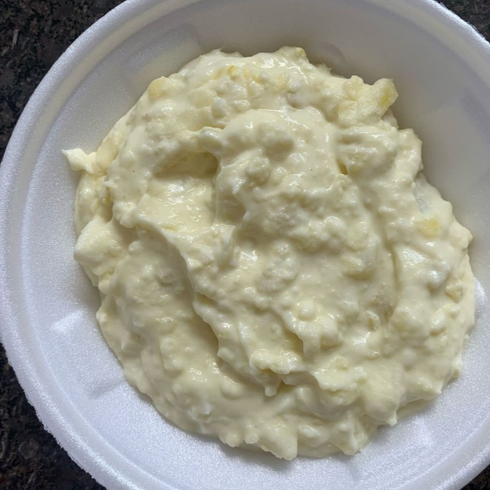 Arroz, feijão, farofa, legume refogado do Dia, massa na manteiga e peito de frango, mais açai tubarão com granola