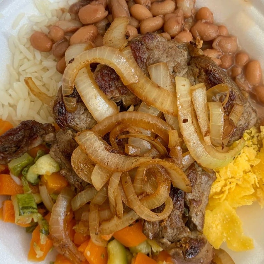 Marmita Com Aproximadamente 350gr Proteina +Ou-80gr E Acompanhamentos +Ou-270gr Arroz , Feijão, Farofa, Legumes Refogados Do Dia, Bife Acebolado