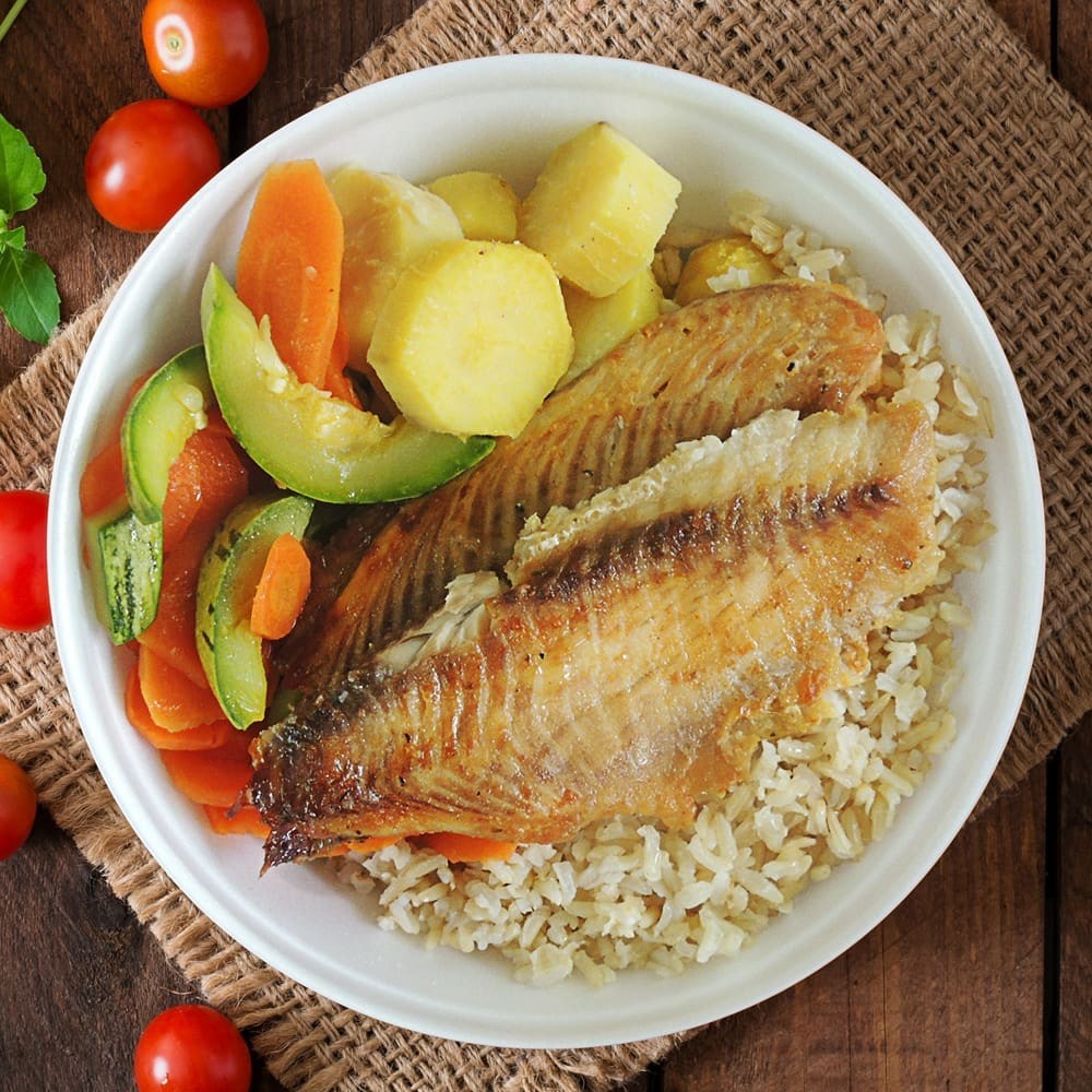 Arroz integral, legume refogado do Dia, aprox. 120gr de tilapia + salada (3 tipos) 500gr Total