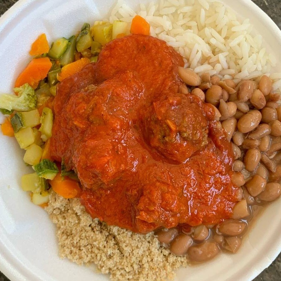 Marmita Com Aproximadamente 350gr Proteina +Ou-80gr E Acompanhamentos +Ou-270gr Arroz , Feijão, Farofa, Legumes Refogados Do Dia, almondegas ao sugo