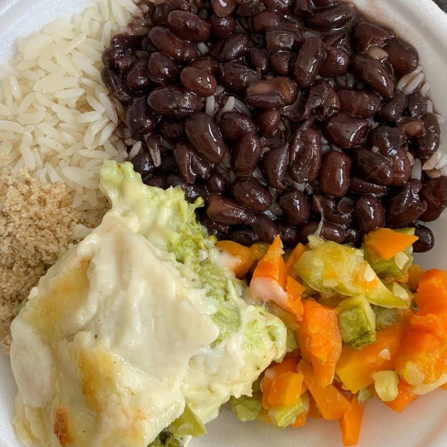 Marmita Com Aproximadamente 350gr Arroz , Feijão, Farofa, Legumes Refogados Do Dia, mais 01 item vegetariano do Dia (soufle ou quiche)