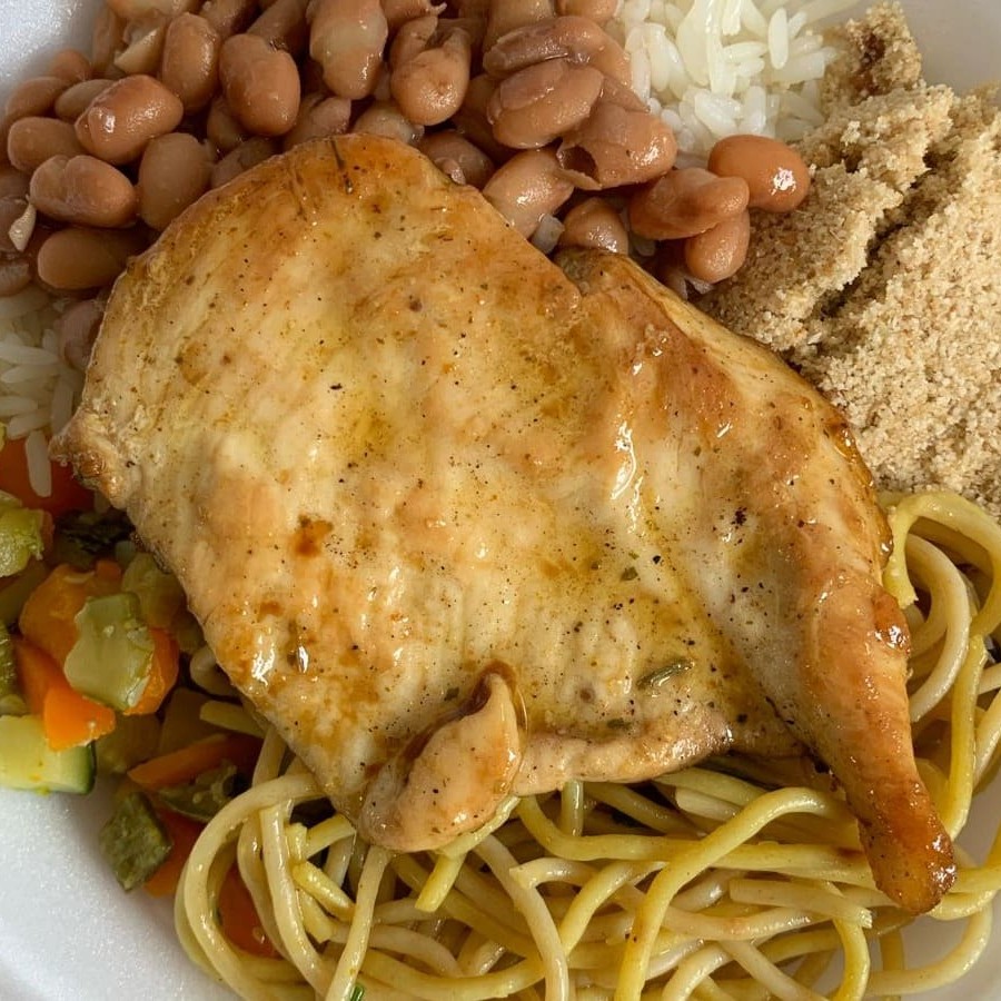 Arroz, feijão, farofa, legume refogado do Dia, massa na manteiga e peito de frango. 500gr