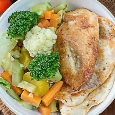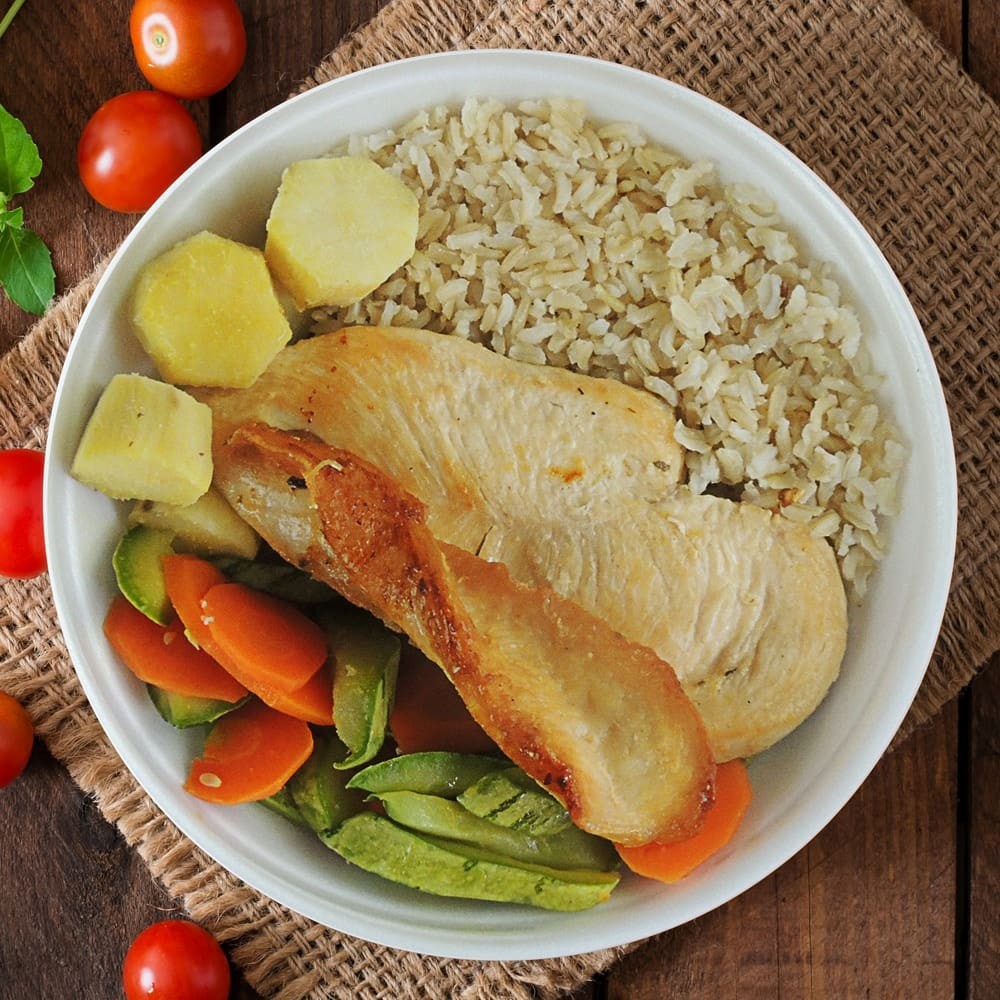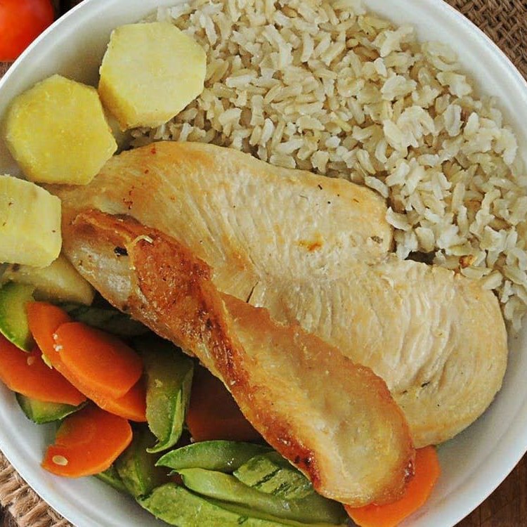 Arroz integral, legume refogado do Dia, batata doce, peito de frango grelhado