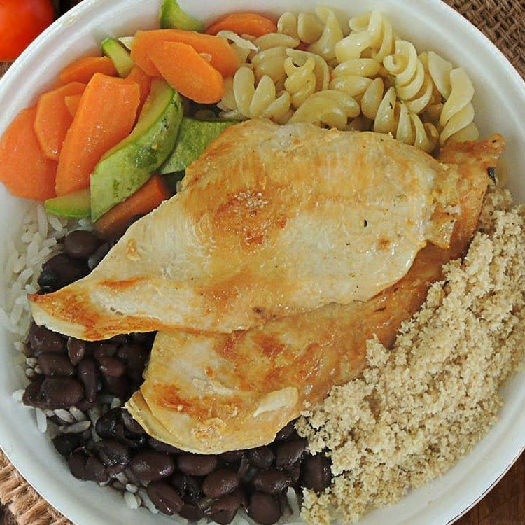 Arroz integral, legume refogado do dia, batata doce, peito de frango grelhado