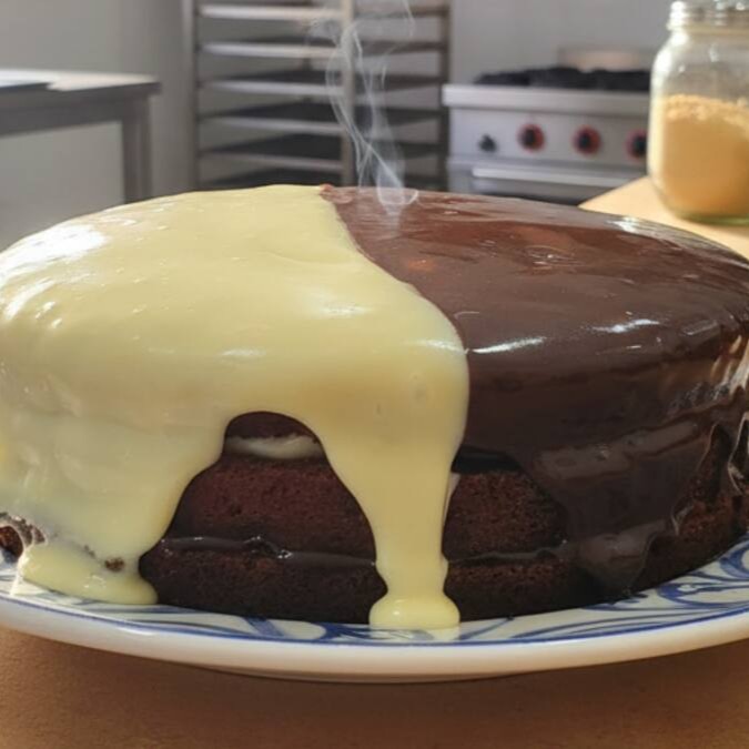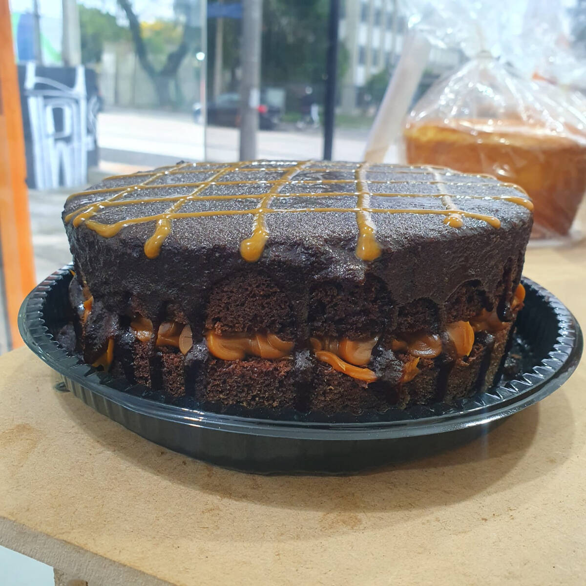 Bolo de pão de mel, com super recheio de doce de leite com toque de cravo e canela e cobertura craquelada de chocolate