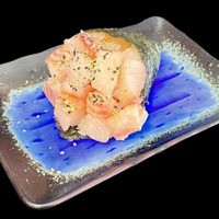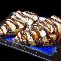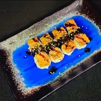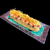 Tilápia em cubos, sunomono, kani, cebola roxa, pepino, cream cheese e crispy couve, base de arroz japonês.