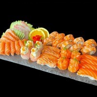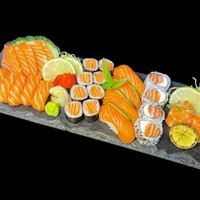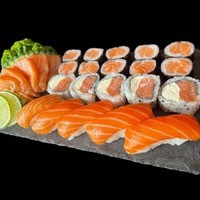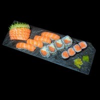 10 sashimis de salmão, 8 hosomaki, 4 niguiris salmão, 4 uramaki Filadélfia, 2 Joe salmão.