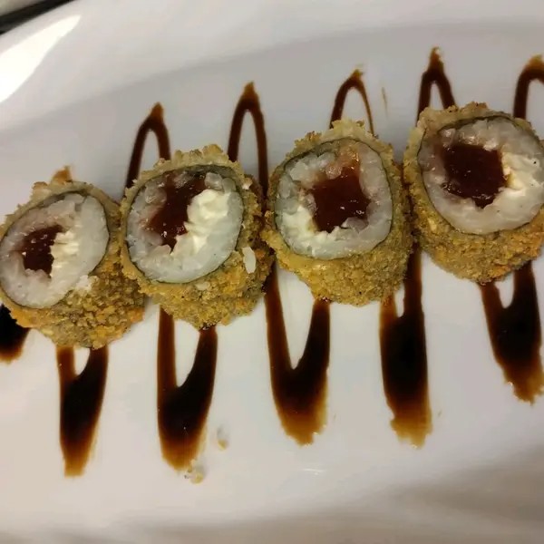 Salmão, Chean chesse, crisp de alho poro, manga, Kani, sunomono cebola roxa base arroz japonês.
