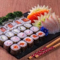 5 sashimi salmão, 5 sashimi tilápia, 4 hosomaki salmão, 4 hosomaki pepino, 4 hosomaki Kani, 4 uramaki Filadélfia, 4 uramaki crisp couve.