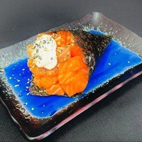 Tilápia e Salmão em cubos, sunomono, kani, cebola roxa, pepino, cream cheese e crispy couve, base de arroz japonês.