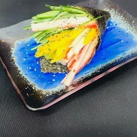 Salmão pepino japonês Kani manga cebola roxa crisp couve base arroz japonês.