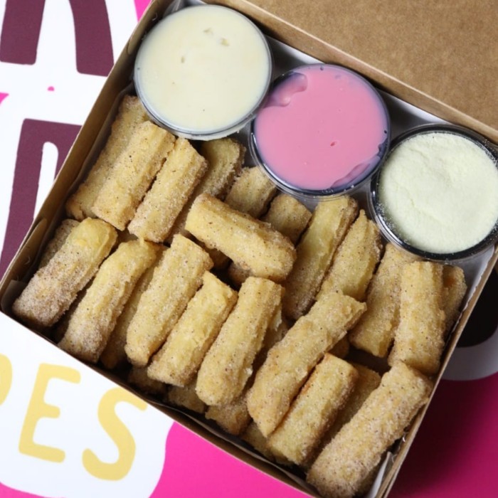 24 mini churros espanhol (palito) crocantes e sequinhos com acompanhamento de até 2 recheios e um topings da sua escolha.