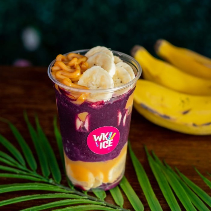 Copo de açaí com camadas de banana, leite condensado, leite em pó e granola