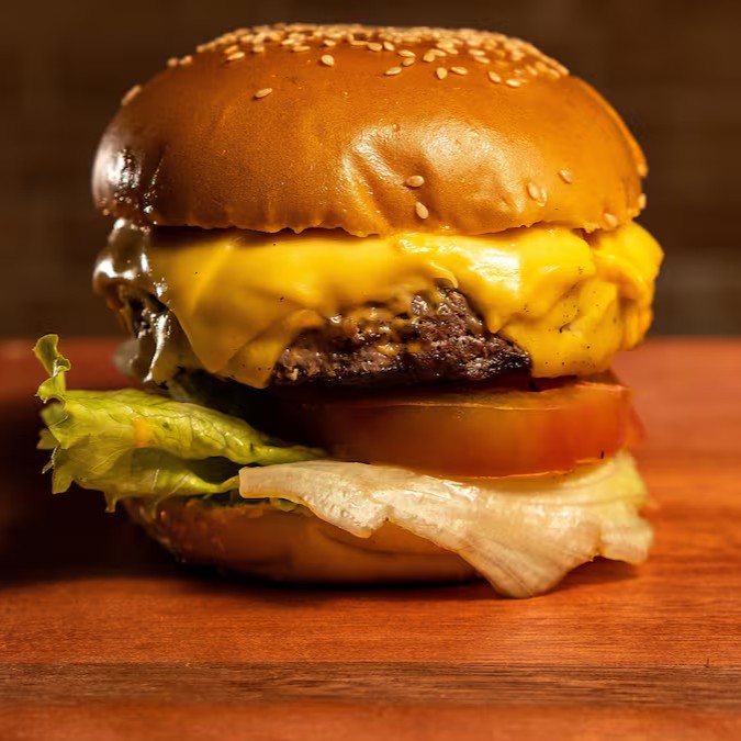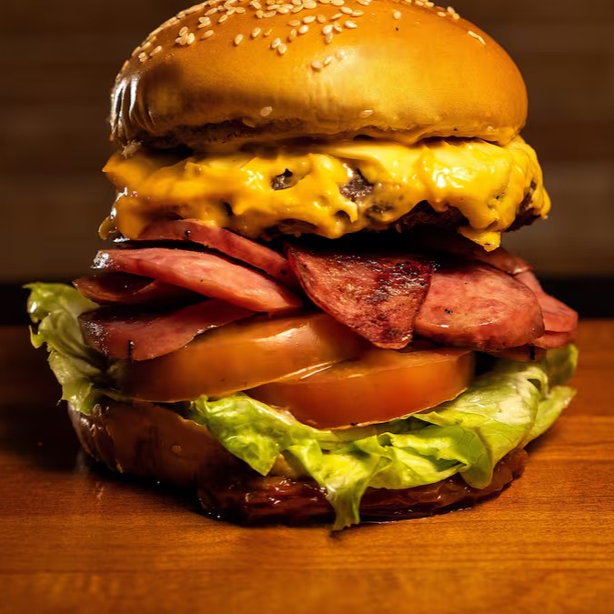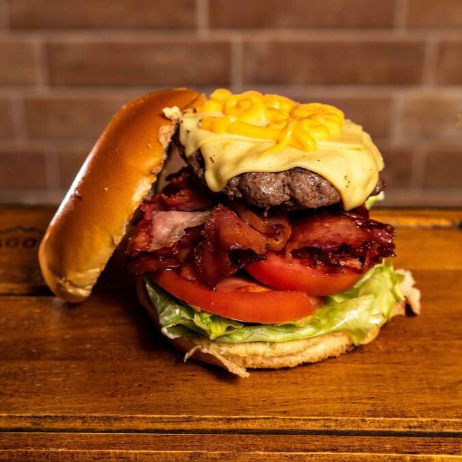 Pao de brioche, hamburguer artesanal de 100g , bacon, queijo, presunto, maionese, alface americana e tomate fresco