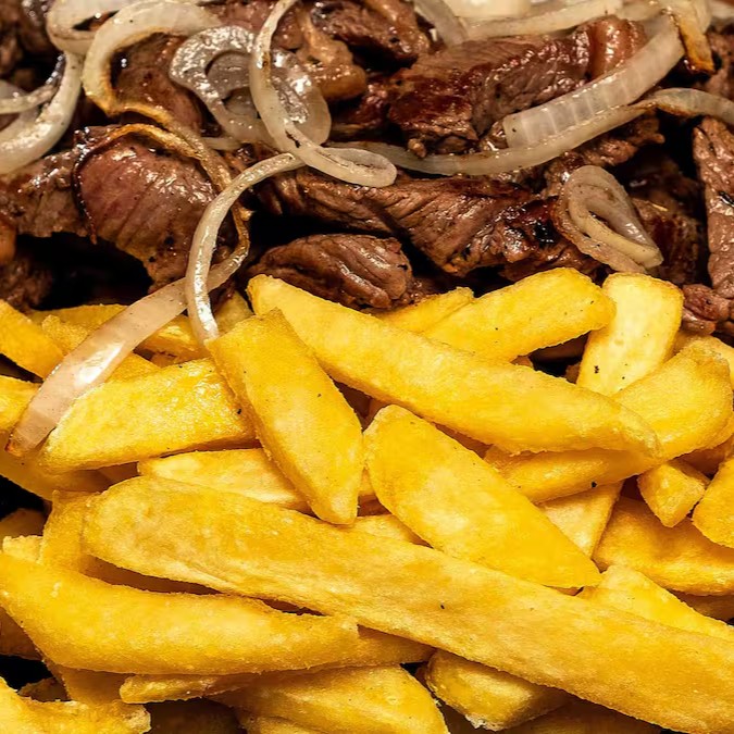 Alcatra 400g feito na chapa com cebolas mais batata fritas 500g