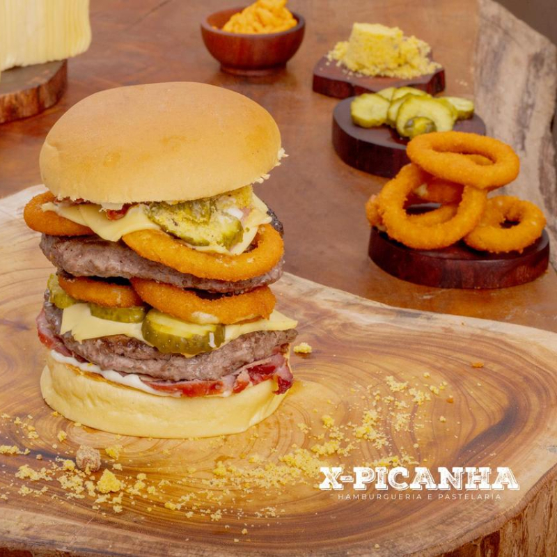 Nosso maravilhoso blend de alcatra angus de dar água na boca, como já sabem a ideia do smash são carnes mais finas, mas aqui no x picanha nos dobramos esta proposta!! São duas carnes de 100g ao ponto coberto por mussarela, anel de cebola crocante, picles por último, damos aquela molhada com nosso molho da casa a base de maionese artesanal de alho e finalizando com nossa excepcional farofa de bacon.