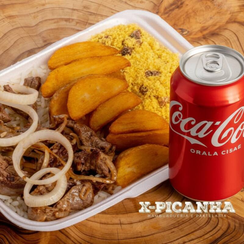Este combo contem 1 marmita de alcatra ( arroz,feijao, fritas, farofa, alcatra acebolada) mais 1 coca lata 310ml