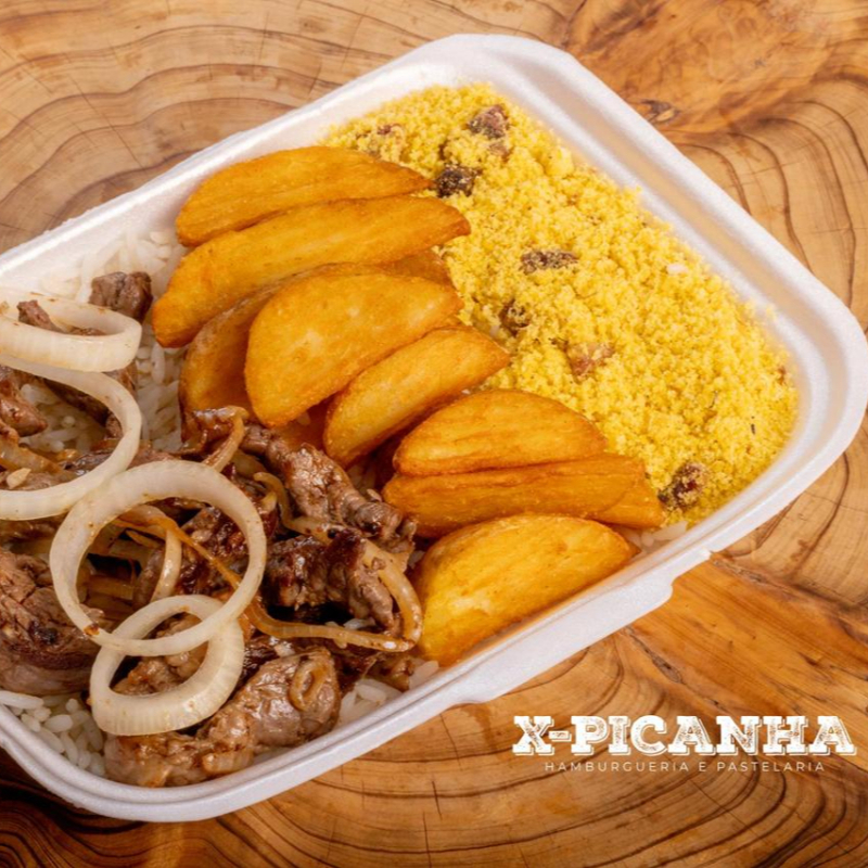 Arroz, feijao, fritas, farofa , picanha premium grelhada acebolada