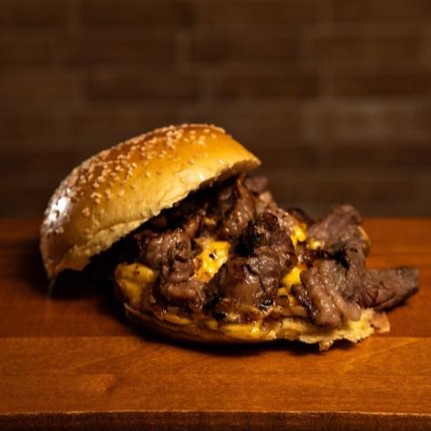 Pao de brioche, maionese, alcatra acebolada, queijo
