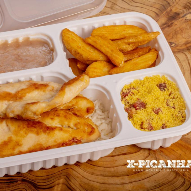 Desfrute de nossa Marmita de Frango', uma refeição completa que transborda sabor e sofisticação. Com arroz soltinho, feijão cozido à perfeição, batatas fritas douradas e crocantes, farofa saborosa e um filé de frango grelhado suculento, este prato é uma opção maravilhosa para uma refeição rápida e satisfatória. Este é mais do que um simples lanche, é uma experiência gastronômica que eleva os pratos executivos a um novo patamar de excelência. Perfeito para os amantes de comida de verdade, repleto de sabor e qualidade. Não deixe de experimentar!