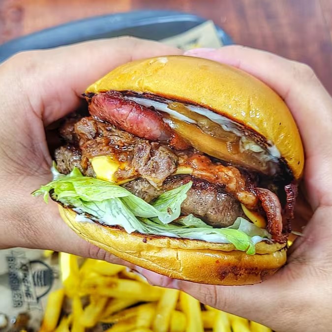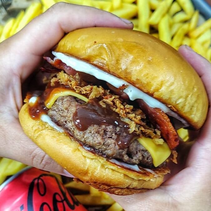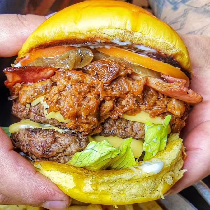 Pão brioche, Hamburguer artesanal 150gr, queijo cheddar, carne desfiada com um molho que é só nosso, bacon, cebola caramelizada, tomate, alface e maioneses da casa.