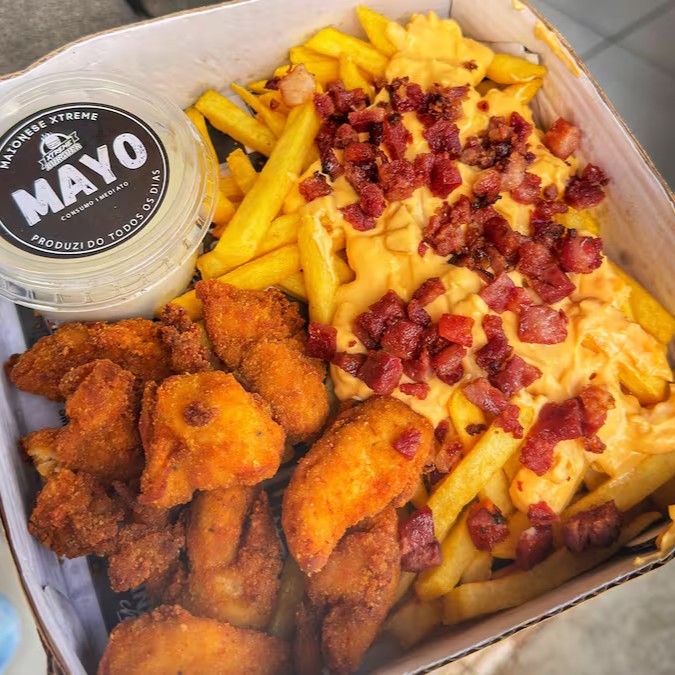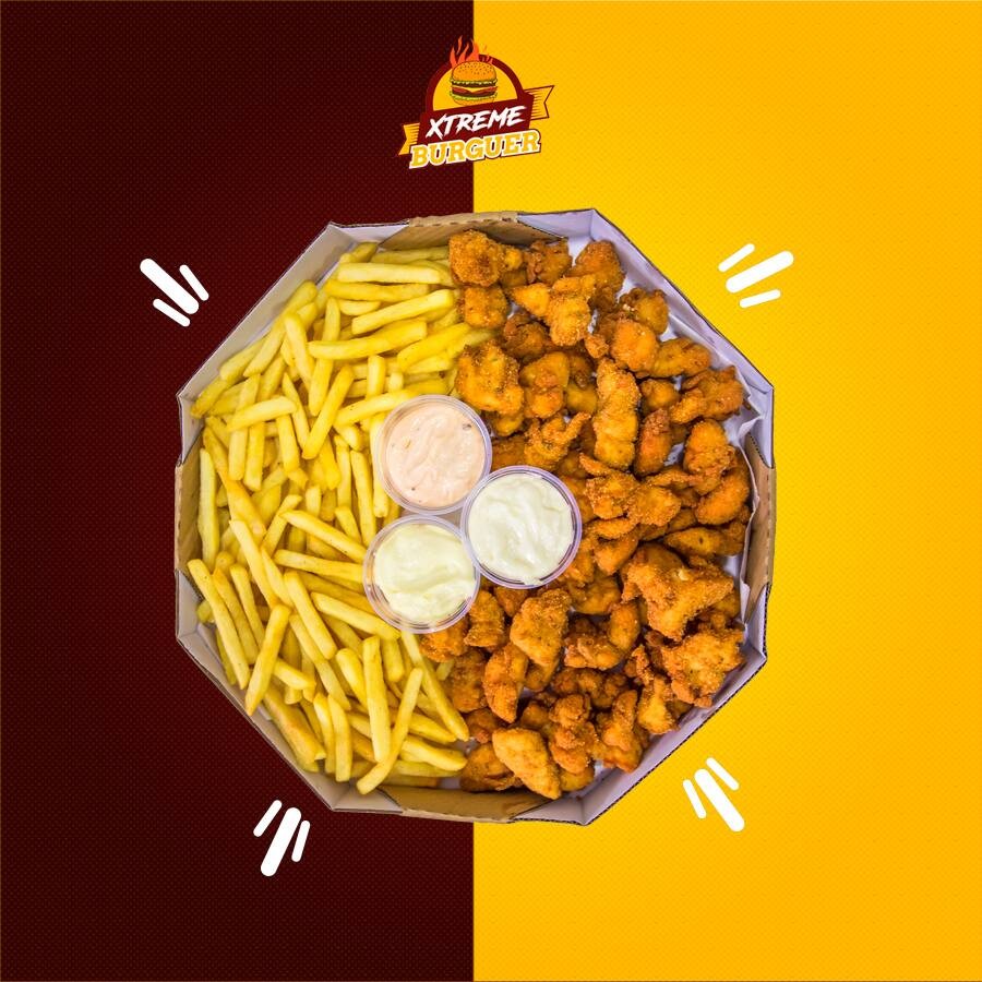 Combo de porção com Batata e Frango com 1 pote de molho especiais Xtreme, serve de 1 a 2 pessoas.