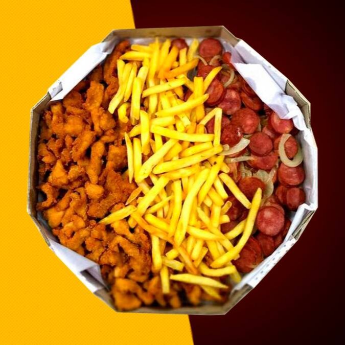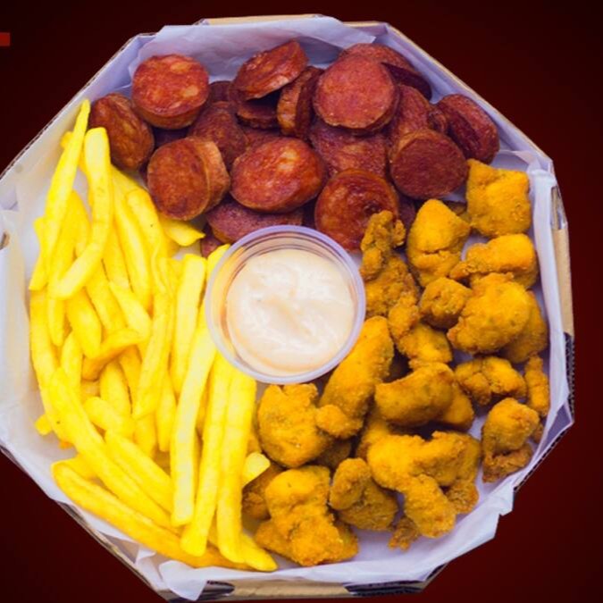 Combo porção com Calabresa, Frango e Batata com 1 pote de molho especiais Xtreme, serve de 1 a 2 pessoas.
