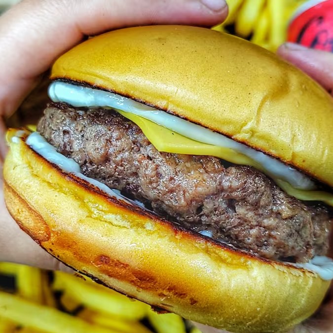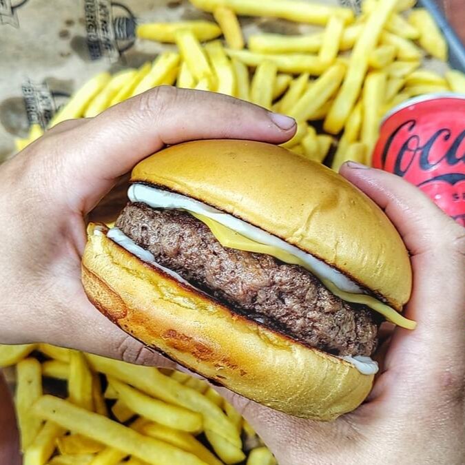 Pão brioche, hamburguer artesanal de 150gr, queijo cheddar e maionese da casa, acompanha batata frita e bebida.