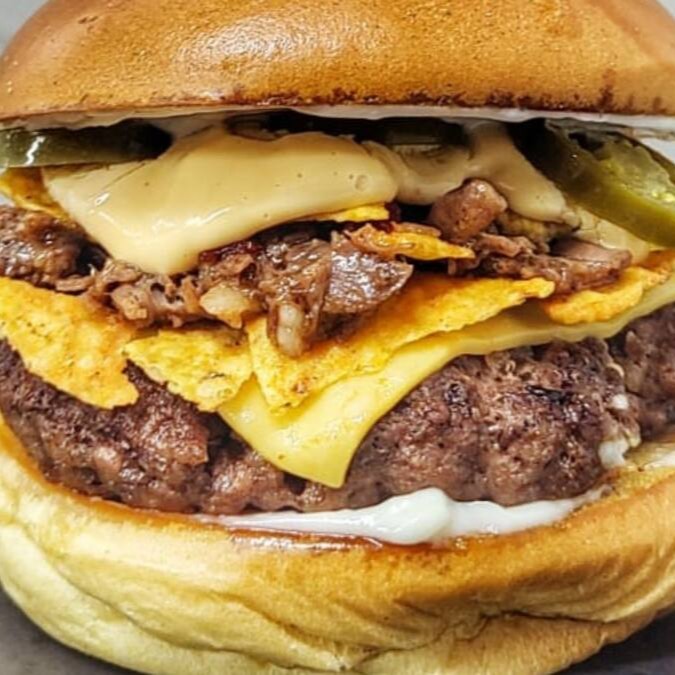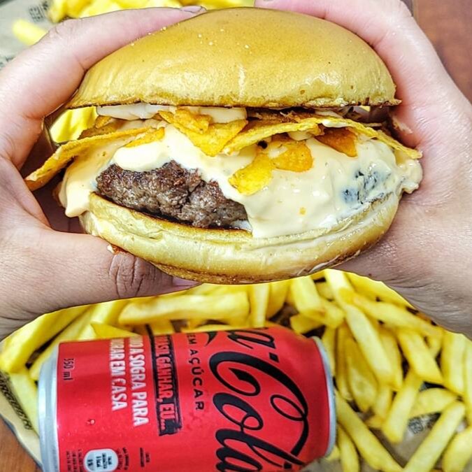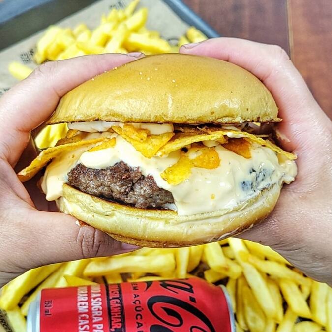 Hamburguer artesanal bovino de 150g coberto por Cheddar cremoso e Doritos e o nosso delicioso pão de brioche selado na manteiga.