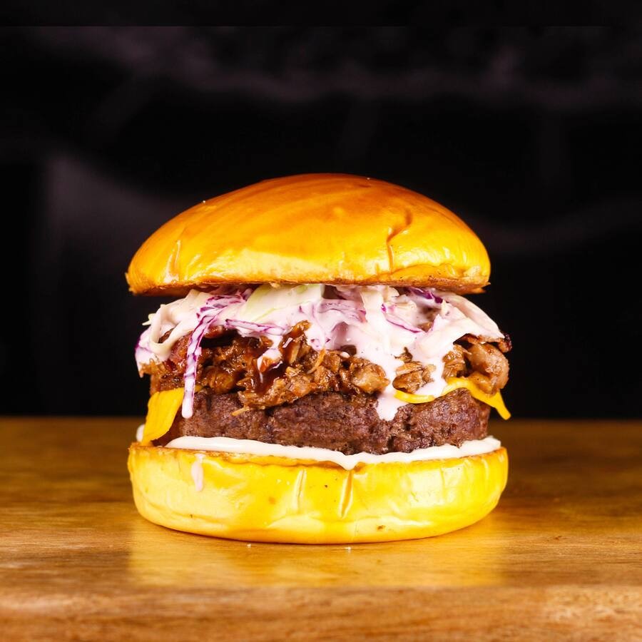 Pão Brioche, hamburguer artesanal de 150gr, pernil desfiado com um tempero exclusivo nosso :), queijo cheddar, salada coleslaw , bacon , barbecue e maionese da casa.