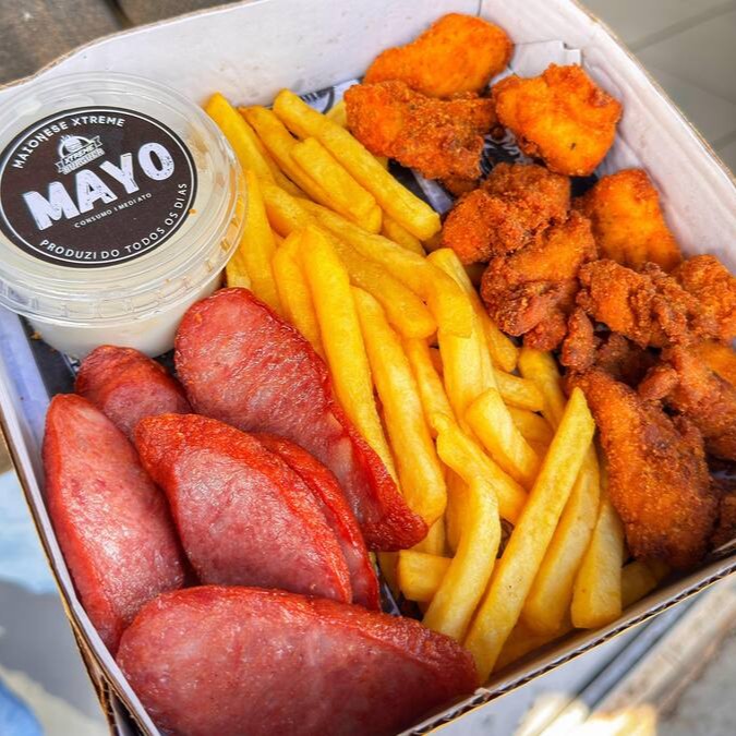 Combo de porção com Batata, Frango e Calabresa com + 3 potes de molhos especiais Xtreme, serve de 3 a 4 pessoas.