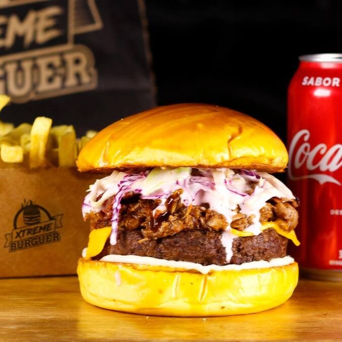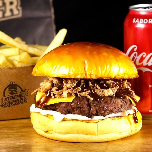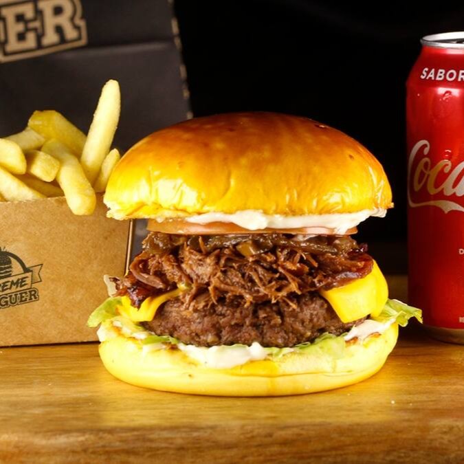 Dois hamburguers artesanais Bovino de 150gr coberto por cebola caramelizada e carne desfiada ao molho xtreme, acompanhado de bacon, queijo prato, Tomate, alface americana, molho especial xtreme e o nosso delicioso pão de brioche selado na manteiga.