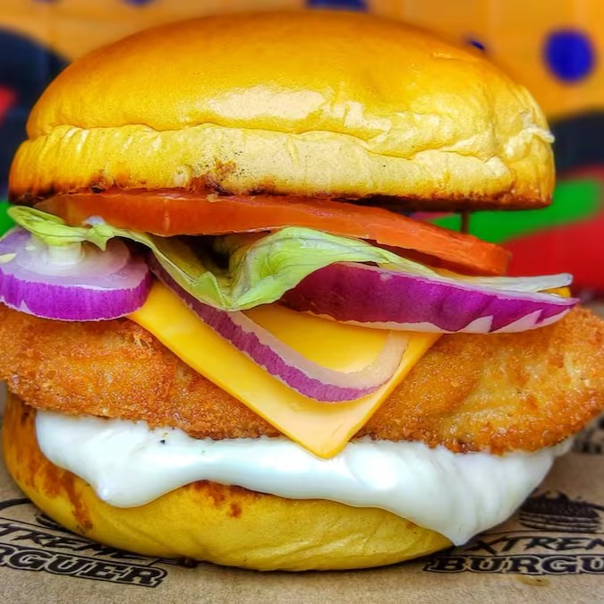 Haburguer de peito de frango temperado, cebola roxa, alface, tomate e Maionese Xtreme no Pão de Brioche selado na Manteiga.