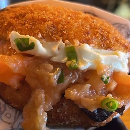 Patê de salmão feito com cream cheese e cebolinha, num pão crocante artesanal feito à base de gohan empanado na panko e frito