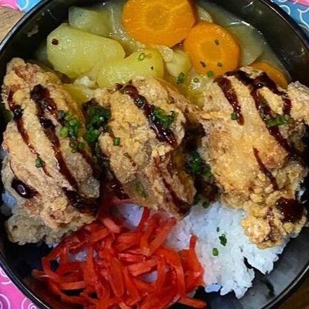 Kare japonês da receita da batchan (avó), curry com batatas, cenoura e cebola, junto com gohan fresquinho do Dia e Kara Ague (sobrecoxa de frango marinada no gengibre e sake, empanada e frita) finalizado com cebolinha e shoga (gengibre rosa em conserva).