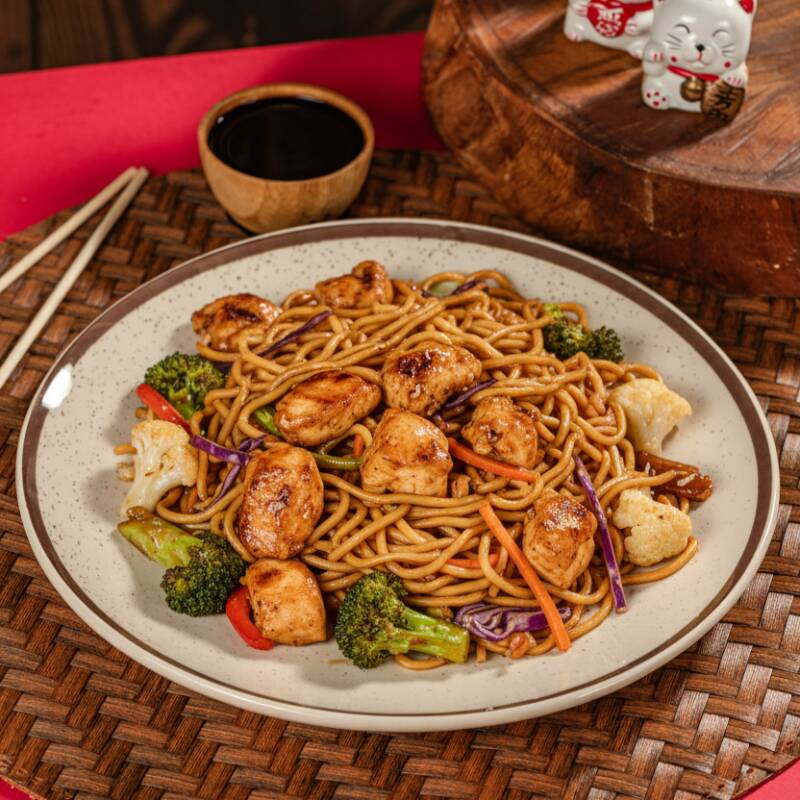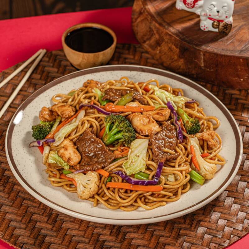 Nosso clássico macarrão oriental, com carne bovina e frango, acompanhado por legumes frescos, finalizados com molho à base de shoyu e nosso tempero exclusivo. Contém carne bovina, frango, acelga, brócolis, cenoura, couve-flor e shoyu.**fotos meramente ilustrativas - devido ao acondicionamento em embalagem e transporte o produto poderá não ter a mesma aparência da foto. CONTÉM: CEBOLA E REPOLHO ROXO