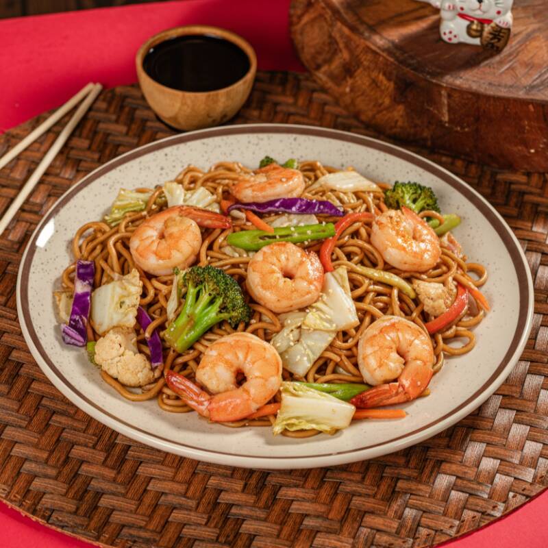 Nosso clássico macarrão oriental, com camarão, acompanhado por legumes frescos, finalizados com molho à base de shoyu e nosso tempero exclusivo. Contém Camarão, acelga, brócolis, cenoura, couve-flor e shoyu.**fotos meramente ilustrativas - devido ao acondicionamento em embalagem e transporte o produto poderá não ter a mesma aparência da foto. CONTÉM: CEBOLA E REPOLHO ROXO