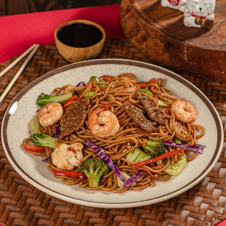 Nosso clássico macarrão oriental, com camarão, carne bovina e frango, acompanhado por legumes frescos, finalizados com molho à base de shoyu e nosso tempero exclusivo. Contém camarão, carne bovina, frango, acelga, brócolis, cenoura, couve-flor e shoyu.**fotos meramente ilustrativas - devido ao acondicionamento em embalagem e transporte o produto poderá não ter a mesma aparência da foto. CONTÉM: CEBOLA E REPOLHO ROXO