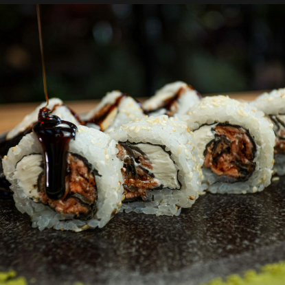 Recheado Com Suculento Salmão Grelhado, Coberto Com Uma Camada De Cream Cheese E Um Toque De Molho Agridoce, É Envolto Em Alga Nori Crocante.