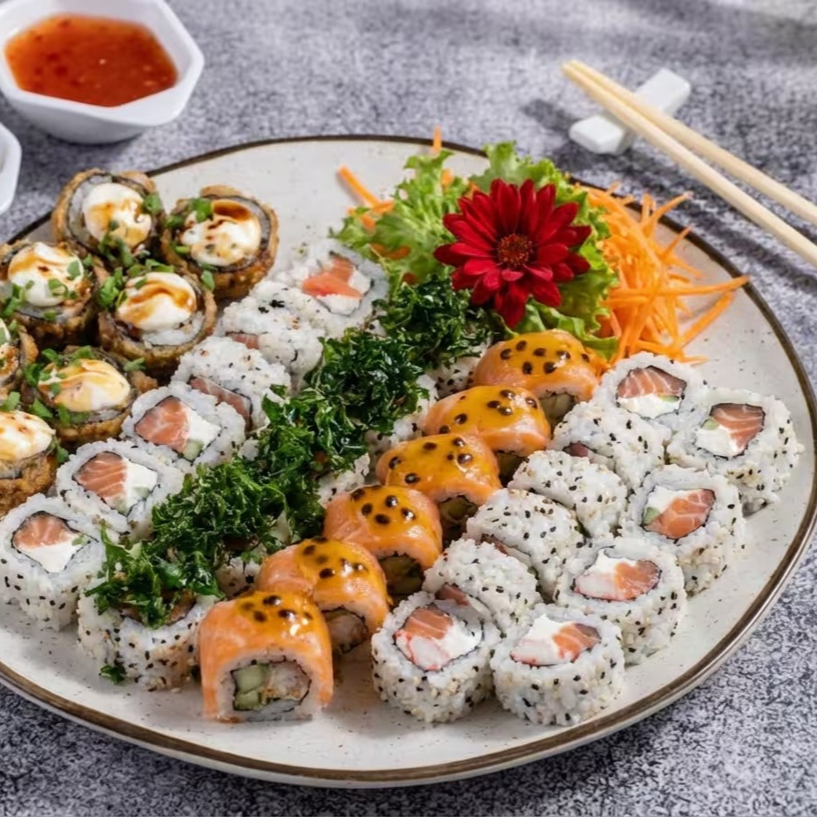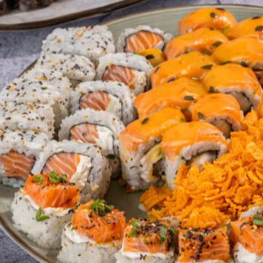 20 Uramaki Filadélfia 20 Uramaki Kani 10 Uramaki Skin Especial Com Cream cheese E Doritos 10 Uramaki Skin Especial Encapado Com Salmão E Molho de maracujá 10 Hossomaki De Salmão 10 hossomaki kani 20 Hot Filadélfia